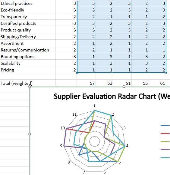 We have made a systematic review of many suppliers, based on sustainability, supply chain and environmental policies. Out of about 40 potential suppliers, 5 went to the final and were evaluated with a weighted score.